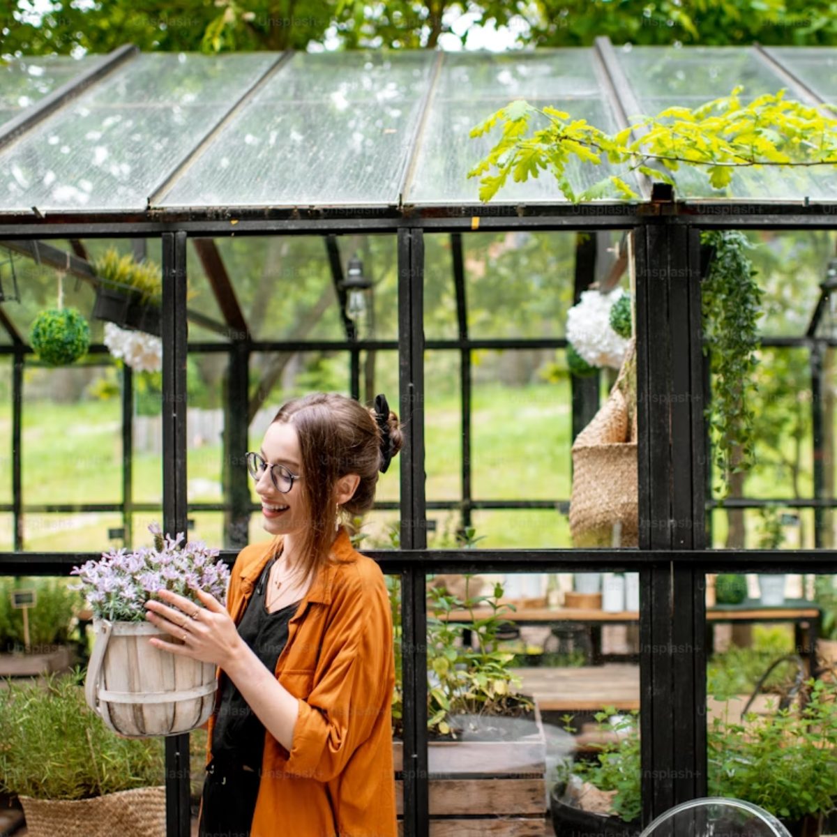 A woman stands in a bright glass extension with plants, enjoying natural light and a seamless indoor-outdoor connection that enhances wellbeing.